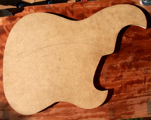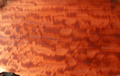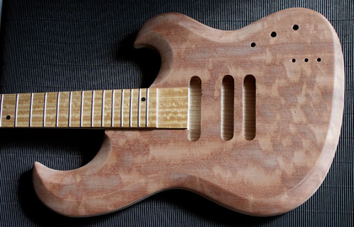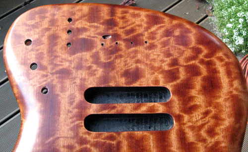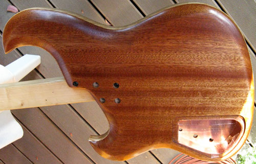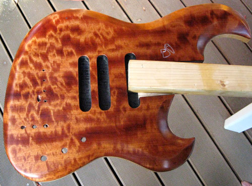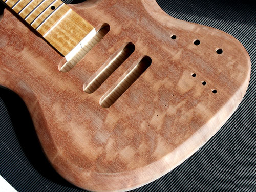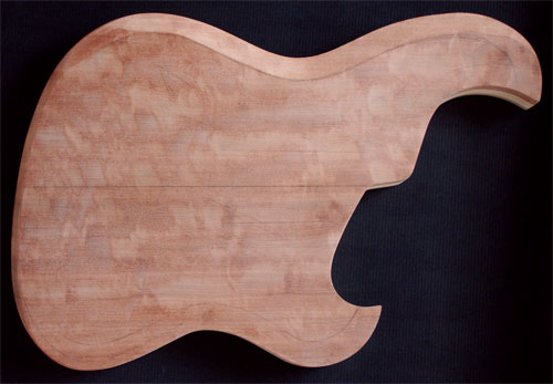 Die Korpusdecke ist 15mm stark, einteilig aus Wölkchen-Mahagoni, an das ich eher zufällig und sehr günstig gekommen bin. Dann folgt eine 20mm dicke Schicht schlichte Esche, zweiteilig, und der "Boden" besteht aus 8mm Khaya, ebenfalls zweiteilig.