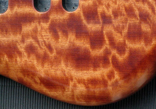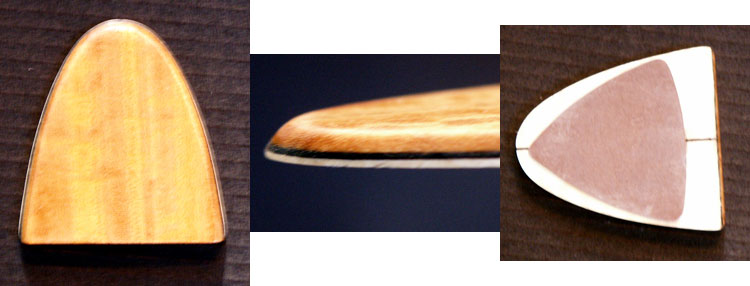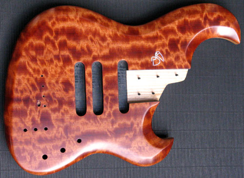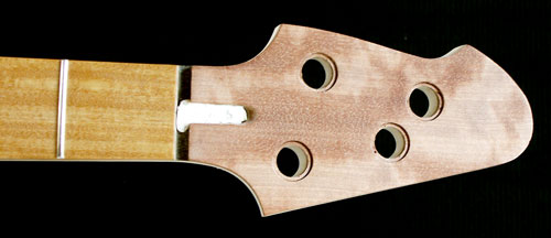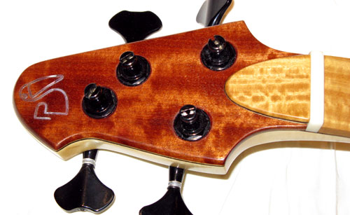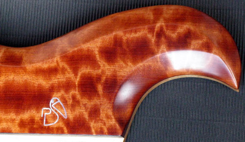 Das Logo auf Kopfplatte und Body ist aus Perlmutt, 0,15mm dünn und per Laser ausgeschnitten.