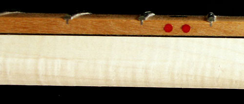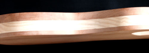 Der Hals ist wie üblich aus Ahorn, stehende Jahresringe, leicht geriegelt und gesperrt mit einem Furnier aus geschwärzter Eiche. Auf dem Hals ist ebenfalls ein schwarzes Eichenfurnier verleimt und dann ein Griffbrett aus Zitronenholz. Oktavinlay aus Ebenholz und Sidedots in rot.