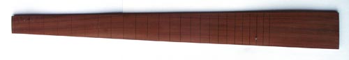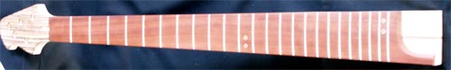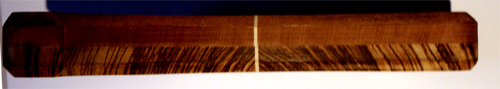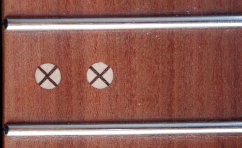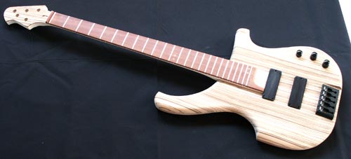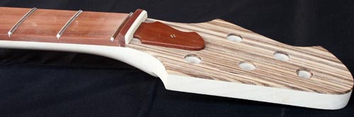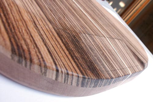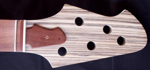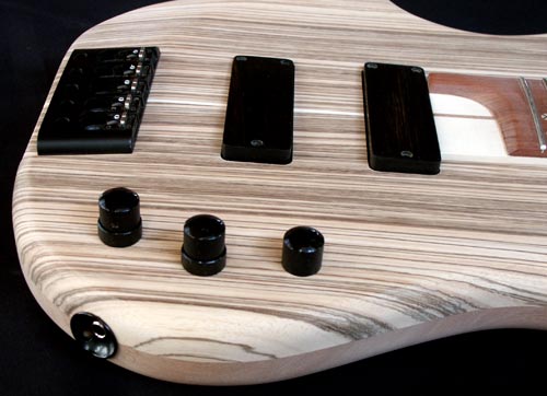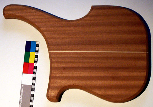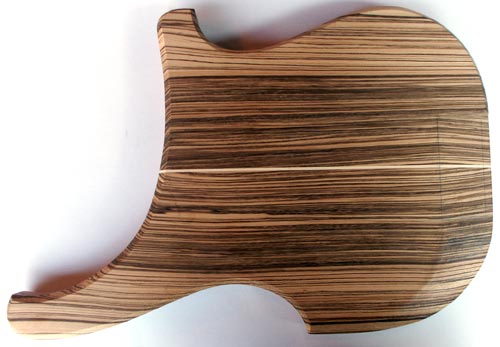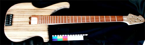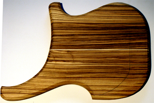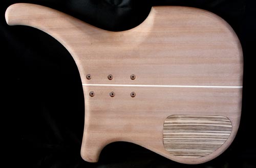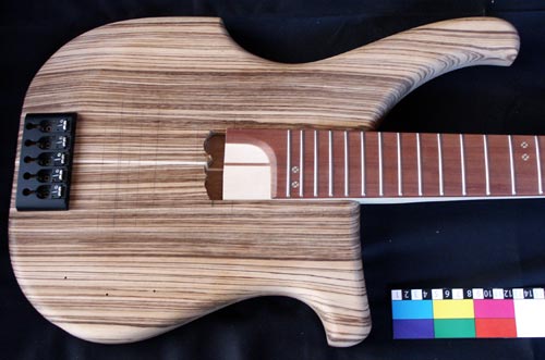 Die Korpusdecke ist 20mm stark und aus Zebrano, aufgetrennt durch einen Streifen Ahornfurnier. Die Rückseite besteht aus 24mm Sipo-Mahagoni, ebenfalls durch Ahornfurnier gesperrt. Der Hals ist wie üblich aus Ahorn mit stehenden Jahresringen und gesperrt mit einem Mahagonifurnier. Den Hals komplettiert ein Griffbrett aus Zwetschge.