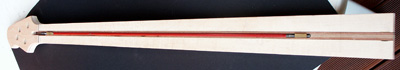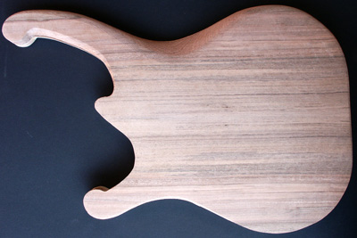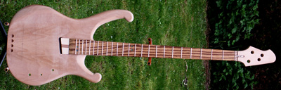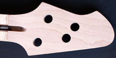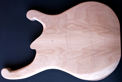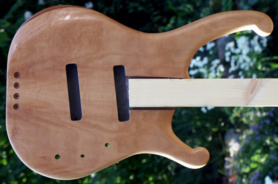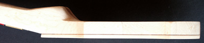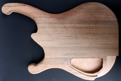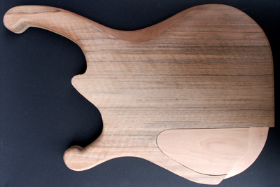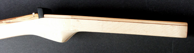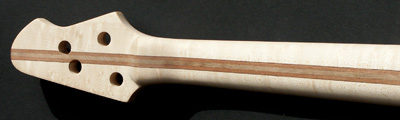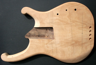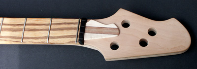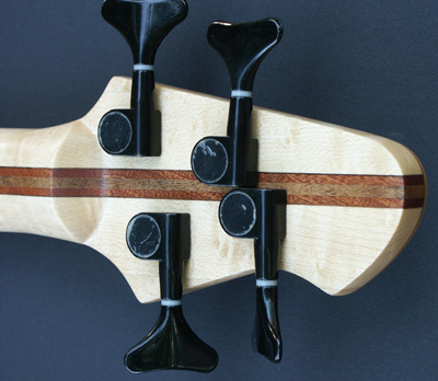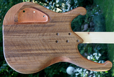 Deutlich anders ist die Korpusstärke: ming ist nur 37 mm stark! Den Hals habe ich siebenstreifig gebaut, aus Ahorn, Nussmaser, Mahagoni und Nussbaum. Diesmal nicht mit angeschäfteter Kopfplatte.