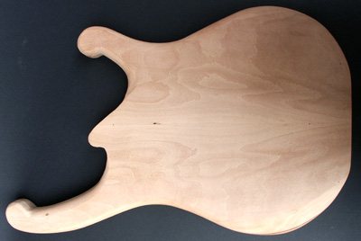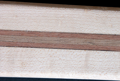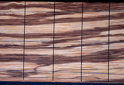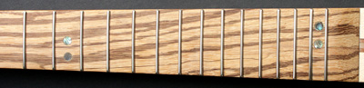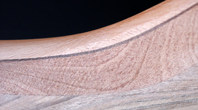 Der Korpus hat eine Decke aus Birne. Das Holz ist im Fladerschnitt aufgesägt und deshalb im Maserbild völlig anders als die geflammte Birne bei The Midge. Darunter kommt ein Furnier aus Nussmaser, gefolgt von einer dickeren Lage Mahagoni. Den Boden bildet eine Lage schön geflammter Nussbaum. Beim Hals zusätzlich europäischer Ahorn und als Griffbrett ein nett gemasertes Stück Zebrano.